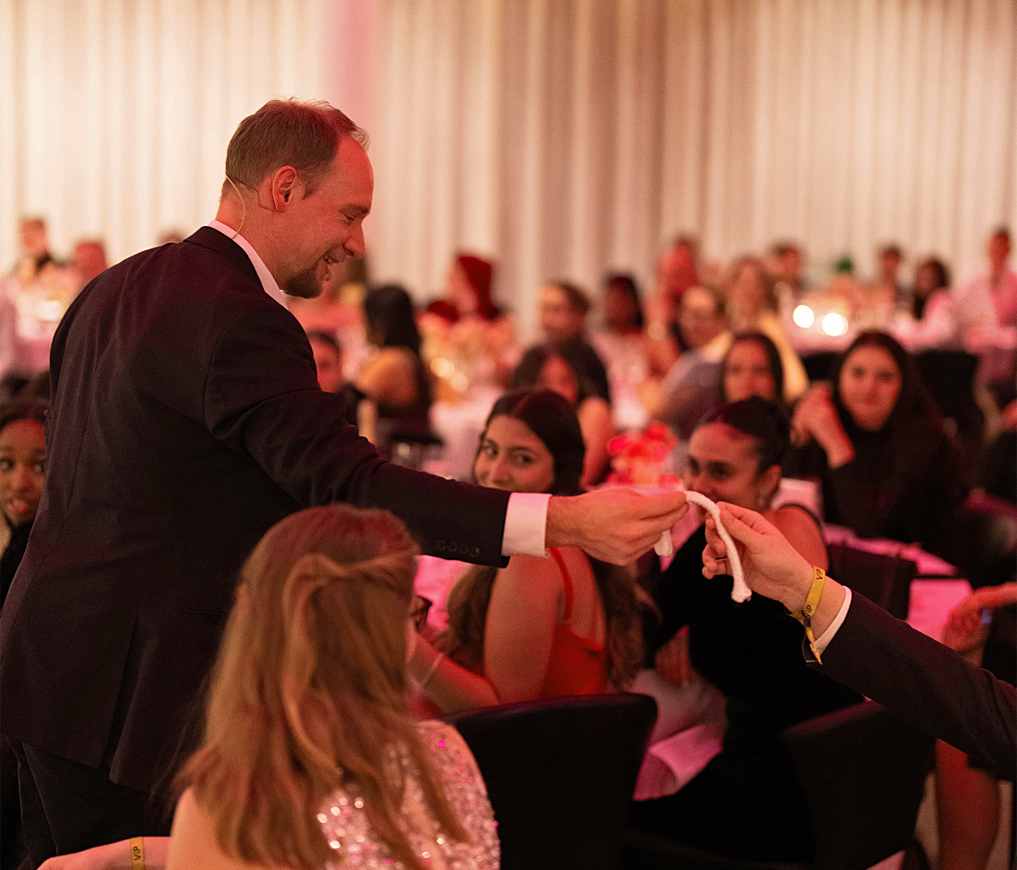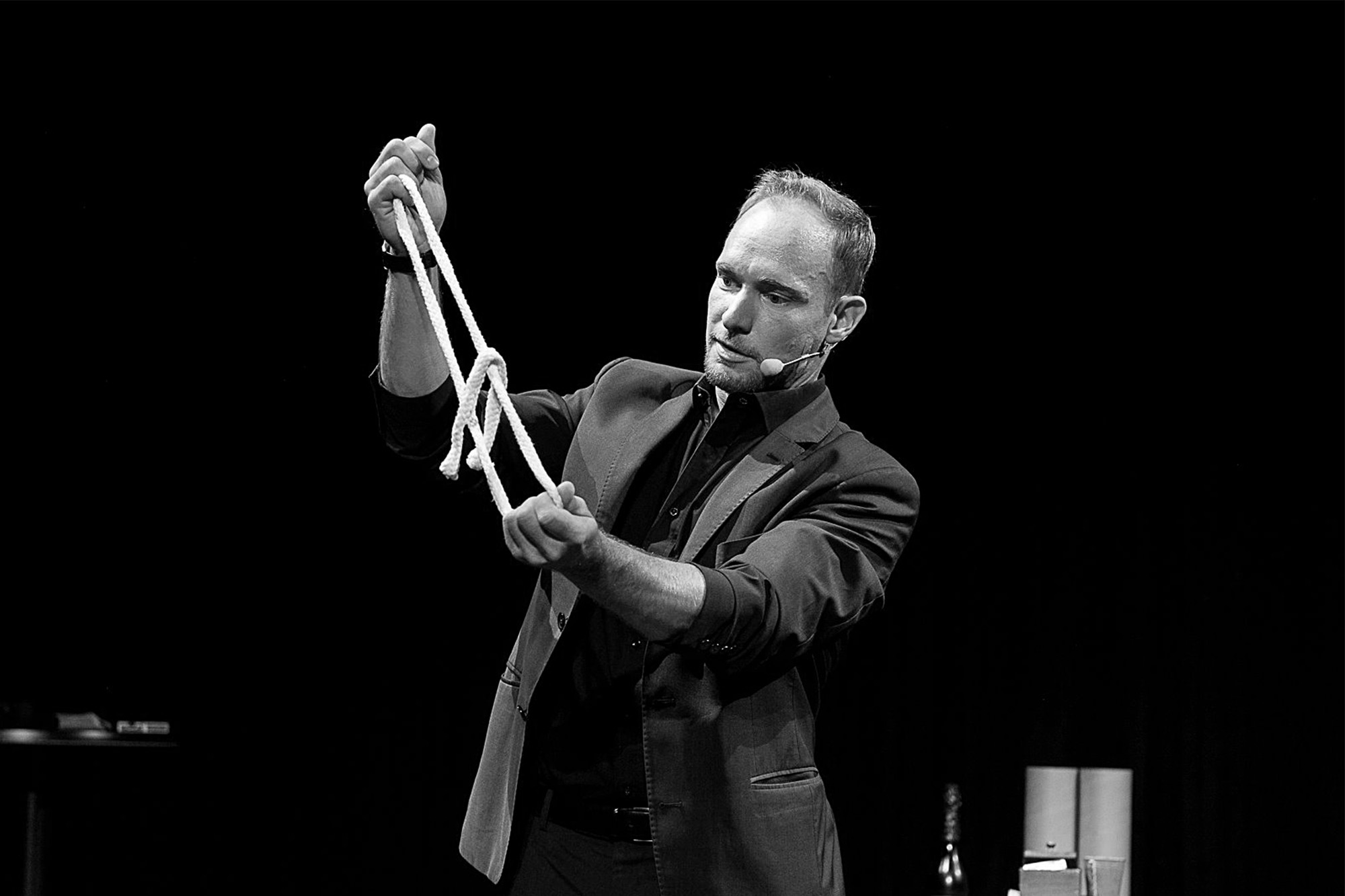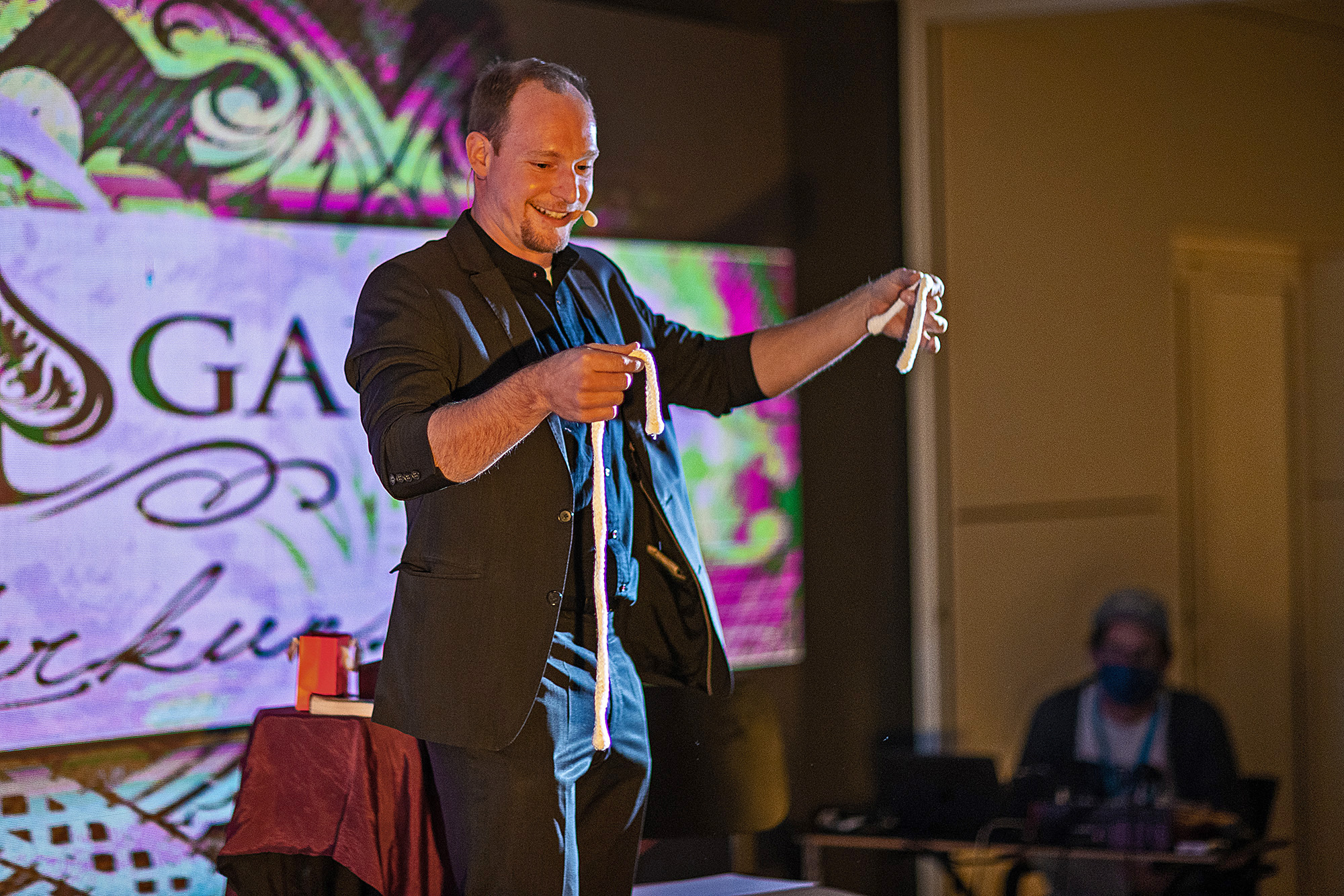 Handelt es sich zum Beispiel um Ihre Hochzeitsfeier, eine kleinere Firmenveranstaltung mit ca. 60- 80 Personen, dann bringt Felix alles mit, so dass Sie sich um nichts kümmern müssen. Felix bringt sein eigenes Zauberequipment, einen kleinen Tisch und falls notwendig auch eine Tonanlage mit Headset mit. Damit ist garantiert, dass Ihre Gäste alles mitbekommen, der Magier einen exzellenten Ton hat und auch alles gut sehen können. Sie müssen sich also um nichts kümmern außer der Lokalität mit einer kleinen Freifläche. Idealerweise sollte diese nicht mittig im Saal sein, sondern an einer Schmalseite. Damit ist garantiert, dass alle gut sehen können und in den kompletten Genuss der Show kommen. Auf großen Galas stellt in der Regel eine Technikfirma die Ton-, Licht- und Bühnentechnik. Ein Tontechniker übernimmt die Einspieler regelt den Sound und sorgt für ein klares Klangerlebnis. Hier ist ein Soundcheck vor der Veranstaltung unerlässlich.
